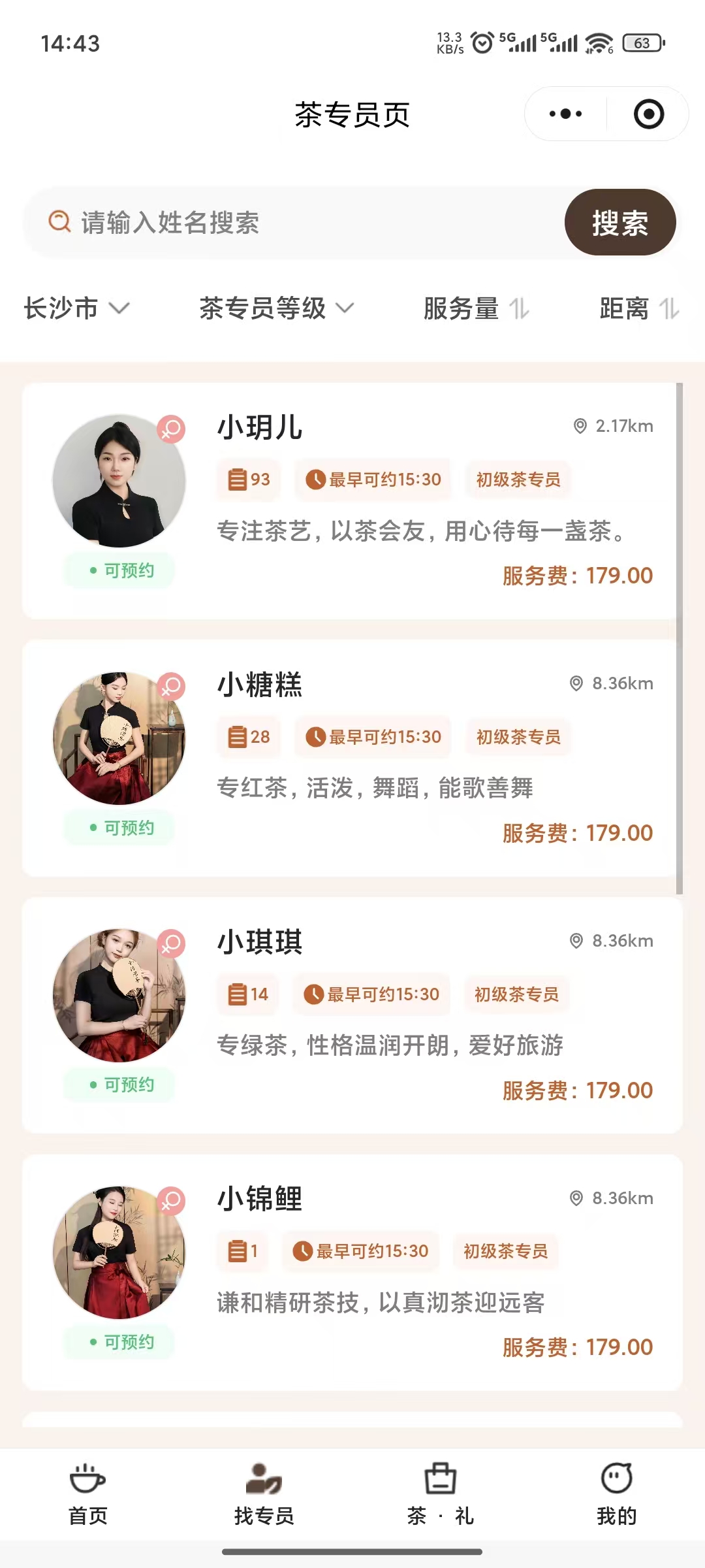 这我们开发的一套上门茶艺小程序和APP案例,包含用户端,茶艺师端和管理端,核心功能是预约上门、茶艺服务和茶礼销售。包含了客户很多自定义的逻辑,目前只是在长沙运营,试运行成功后会开放加盟面向全国。