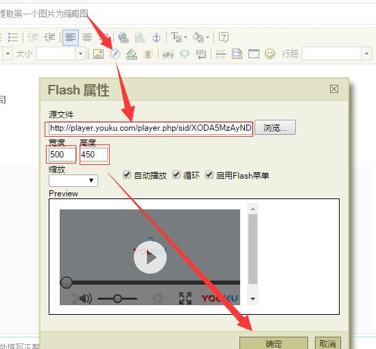 将你复制的FLASH视频的地址粘贴到上面的源文件位置,并填写视频的大小、宽高,如上图。然后确定。