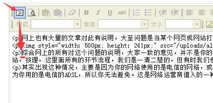 然后回到我们的后台,在编辑器中,点击第一行的第一个按钮,将编辑器切换到'source code'模式,也就是网站代码模式(切换前是visual),将光标定位到的地方放置如下图: