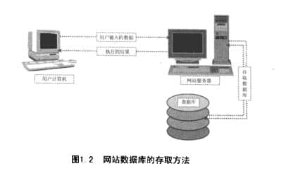 当您浏览各大网站的网页时,您会发现有些网站提供了数据查询功能。比如在一些网络书店的网站上,输入要查询的关键词,就可以在网站上找到相关的信息。此类网站使用网站数据库技术。它将查询与本网站链接的数据库中的数据,并将找到的数据发送回浏览器,最后将结果呈现给用户。这种带有链接数据库的网站称为网站数据库。简单来说,网站数据库就是用户以浏览器为输入界面,输入需要的数据,浏览器将数据传送给网站,网站再对数据进行处理,比如将数据存储在数据库,或者对数据库等进行查询操作,最后网站将运行结果返回给浏览器,并通过浏览器将结果告知用户,如图1.2所示。