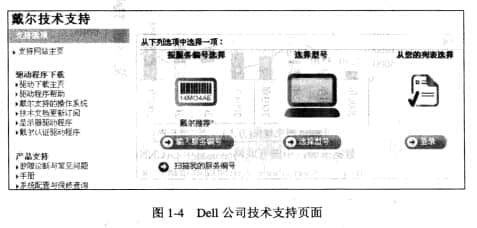 接触和沟通是业务流程中最重要的元素之一,每个精明的商人都应该重视与他人广泛接触的重要性。企业通过建设企业网站,可以在网页上24小时为成千上万的人提供一个联系和沟通的渠道,任何人都可以随时使用这个渠道。当今的业务流程更加注重为客户提供优质的服务,可以通过越来越便捷的方式在网站上为客户提供各种服务。例如,为客户定制个性化的沟通平台,根据客户喜好不定期发送最新的公司信息,24小时在线客服无需支付话费,都可以简单快捷地实现。图1-4 显示了Dell 的客户在线支持网页。