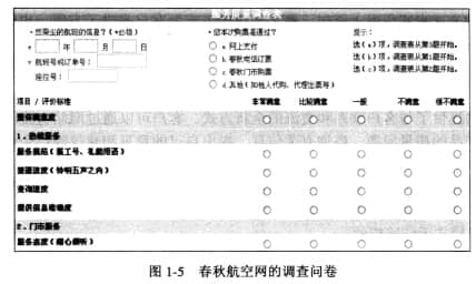 一个新产品推出后,用户的反馈对于每个企业来说都是非常重要的。利用互联网的双向信息交流功能,可以帮助企业获得市场的即时反馈,而在线问卷调查是了解用户最常用的手段。网络问卷可以通过网站、E-mail发布和检索,直接使用数据库记录相关数据,可以大大节省时间、金钱和人力。结果易于量化、统计处理和分析,可进行大规模调查。图1-5 是春秋航空的一份调查问卷。
