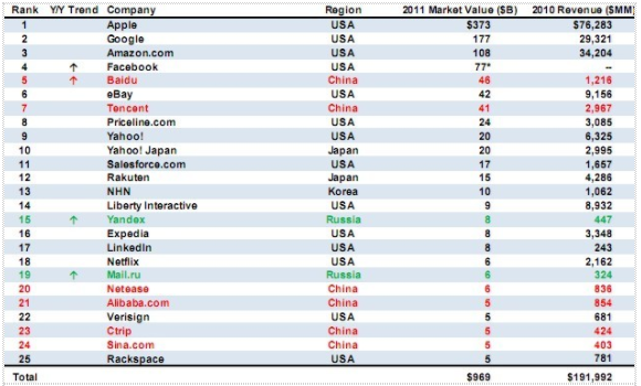 进入前25名的中国企业有:网易第20名,市值60亿美元,2010年营收8.36亿美元。阿里巴巴第21名,市值50亿美元,营收为2010年8.54亿美元。携程排名第23,市值50亿美元,2010年收入4.24亿美元。新浪排名第24,2010年收入4.03亿美元。